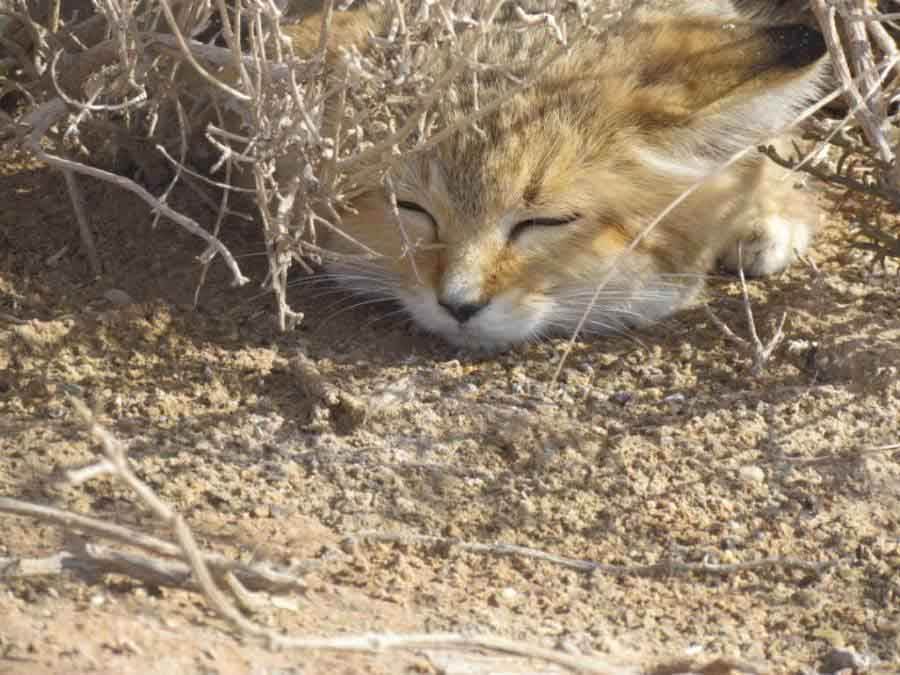 Арабские пустынные коты не живут одним днем. Убив крупного зверька, маленький хищник закапывает его в песок, чтобы вернуться и доесть.