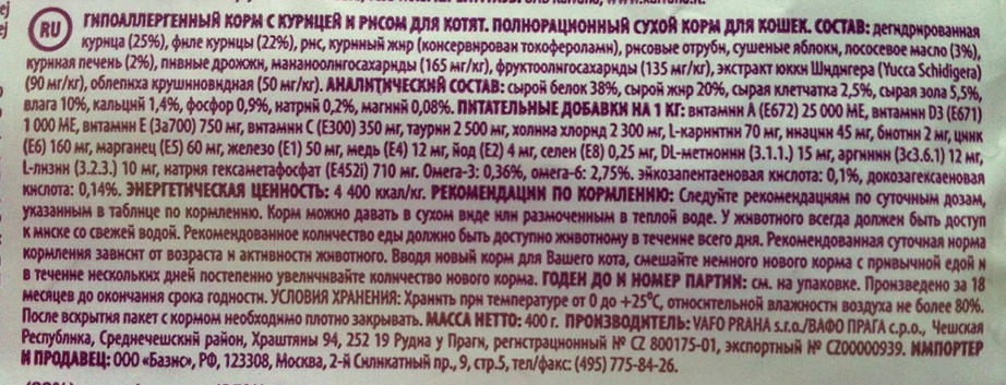 Все корма изготавливаются исключительно на чешских заводах Vaho Praha. Для многих потребителей это хороший показатель, так как при переносе процессов производства в Россию в большинстве случаев качество корма начинает значительно падать.