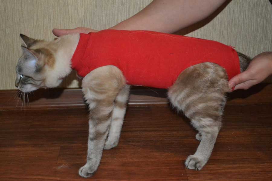 При этом важно не запачкать в них саму ткань. После операции кошки бывают агрессивны, поэтому важно понять, как снимать попону с кошки, не травмируя ее. Лучше всего обрабатывать шов, не убирая бандаж полностью, а просто развязав несколько нижних завязок, так как обычно он находится внизу живота