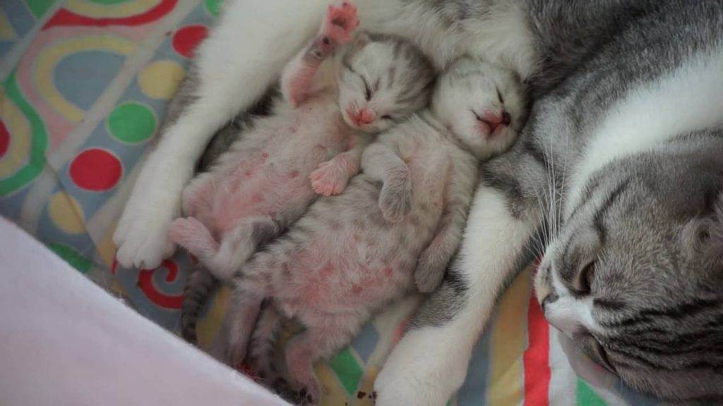 Основная забота родившей кошки – накормить каждого малыша досыта, отогреть его и вылизать