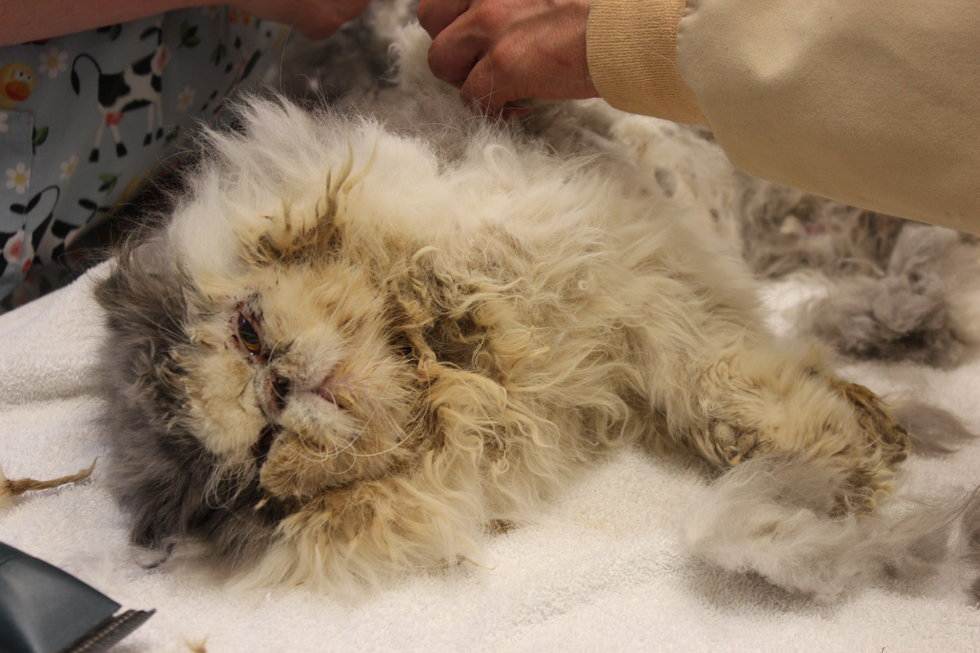 Если на теле кошки обнаружены колтуны или спутавшиеся участки шерсти, их лучше удалить специальными ножницами с закруглёнными концами. Делать это необходимо аккуратно, чтобы не поранить животное.