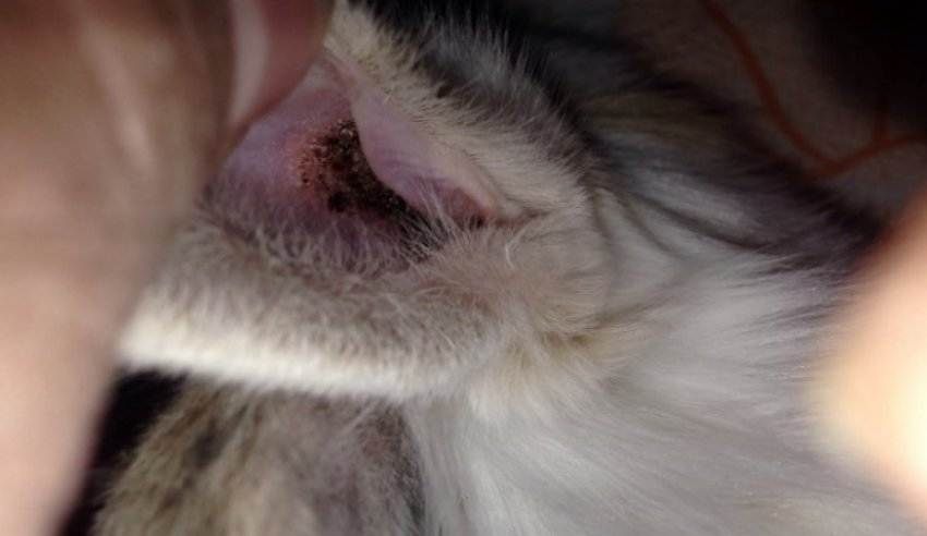 Недуг вызывают округлые клещи размером до 1 мм, которые поражают слуховые проходы животных. Запущенная стадия опасна осложнением, инфекциями, образованием гноя. Жидкость стекает в ухо и образует в нём пробку – в конечном итоге это приводит к менингиту и смерти питомца.
