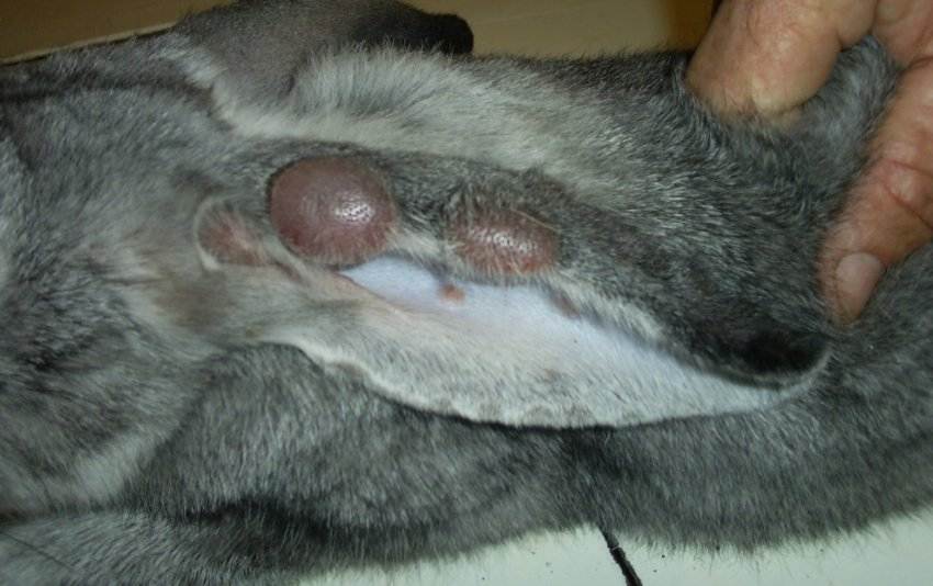 - подкожные опухоли – шишки на ушах кролика, на голове, рядом с гениталиями и анусом;