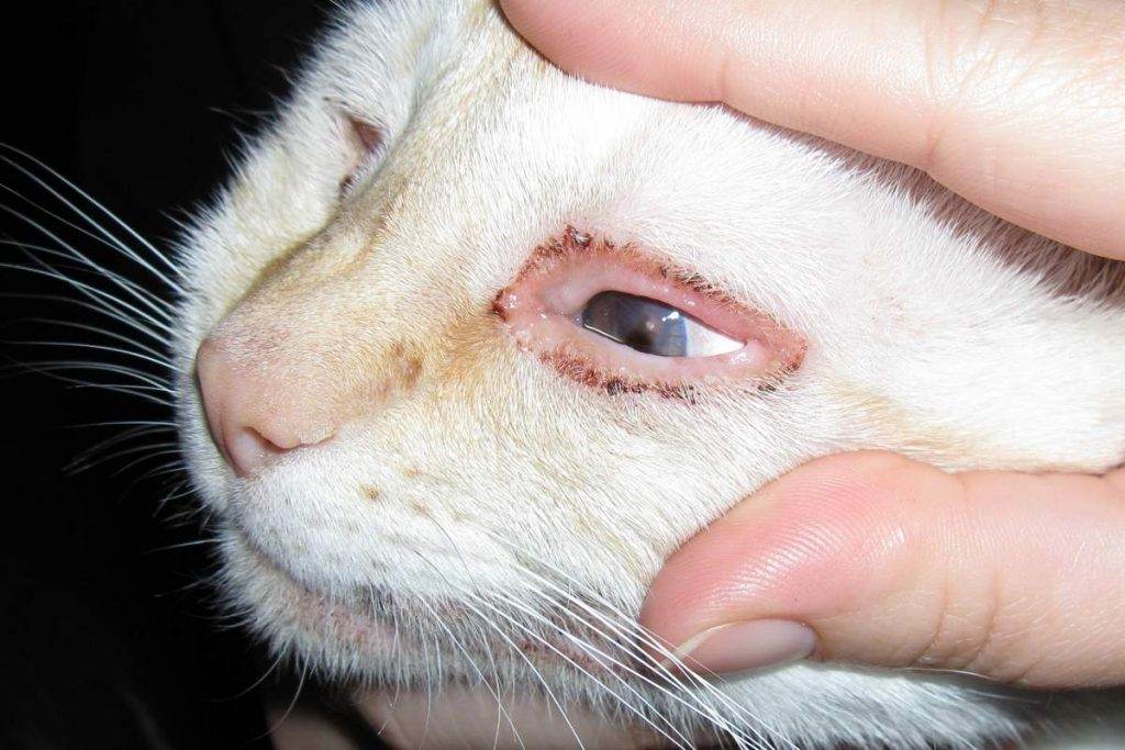 Повреждение глаза провоцирует обильное выделение прозрачной или водянистой жидкости, которая при высыхании становится коркой. Животное испытывает общее недомогание, состояние усугубляется постоянным зудом и частым морганием.