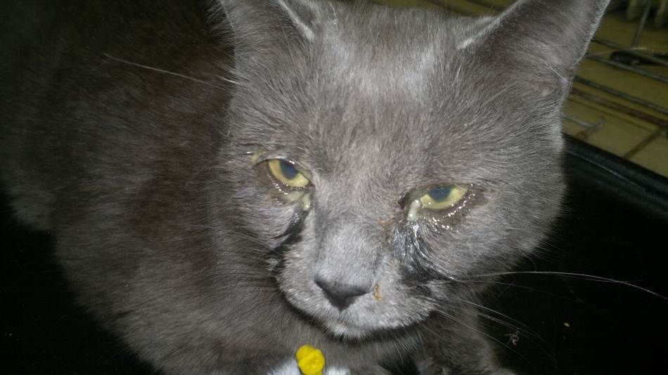 Нагноения видны невооруженным глазом. Обычно гной подсыхает и образует светло-серую корочку. Засохшие капли образуются на шерстке в области глаз и носа. Слишком обильные выделения могут даже “склеить” глаз и он не будет открываться. Котята будут стараться убирать образования путем умывания, но это может лишь усугубить ситуацию: инфекция разнесется, и результаты будут не самыми приятными.