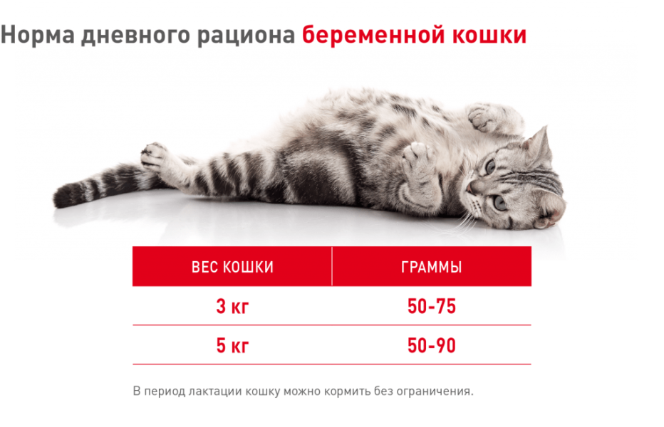 К третьему дню большинство кошек могут нормально питаться и в их рацион вводятся привычные продукты. Изменения должны коснуться частоты кормления. На последних сроках беременности кошка физически не может съедать достаточное количество пищи за один раз и ее нужно перевести на дробное кормление. Сразу после родов кошку также рекомендуется кормить небольшими порциями, но часто, 3–5 раз в день.