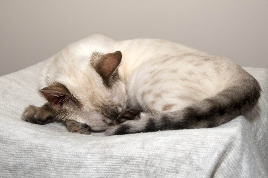 дождаться, когда он крепко заснет; осторожно, стараясь не разбудить четвероногого любимца, поднять переднюю лапу; поместить термометр под мышку, отпустить лапу, удостоверившись в том, что устройство надежно зафиксировано; через определенное время достать градусник, проверить его значение. Прибегать к такому методу нужно только в крайнем случае. С его помощью сложно добиться точных результатов, особенно если кошка пушистая, и из-за густоты шерстного покрова затруднен доступ к телу