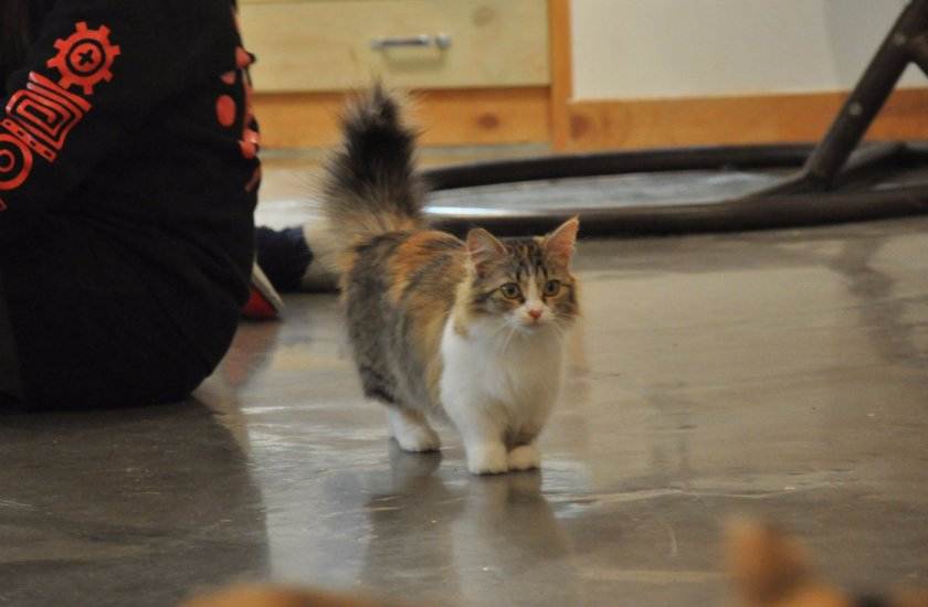 На теле кошки соседствуют прямой глянцевый мех, длинные упругие локоны в форме спирали, короткие завитки и спутанная шерсть. Хвост при этом огромный, распушенный по форме напоминает беличий.