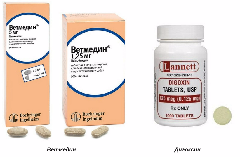 В терапии сердечной недостаточности у животных применяется положительный инотроп – сердечный гликозид, например Дигоксин. Эффективен препарат при наличии у питомца мерцательной аритмии. Ветмедин – современное кардиотропное средство в ветеринарии, действующим веществом которого является положительный инотроп – пимобендан. Ветмедин расширяет коронарные сосуды, усиливает сердечные сокращения, улучшает снабжение миокарда кислородом.