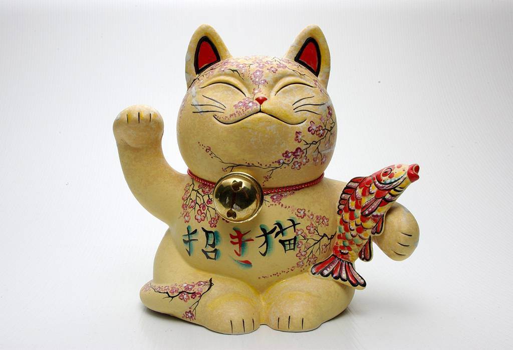Большой популярностью пользуются фигурки приглашающего кота – Манэки-нэко. Считается, что статуэтка помогает привлечь в дом богатство, удачу, благополучие. Если кот машет правой лапой, он привлекает успех, а левой – деньги. Во многих восточных торговых лавках у входа можно увидеть статуэтку приглашающего питомца. Он машет левой лапкой, заманивая клиентов.
