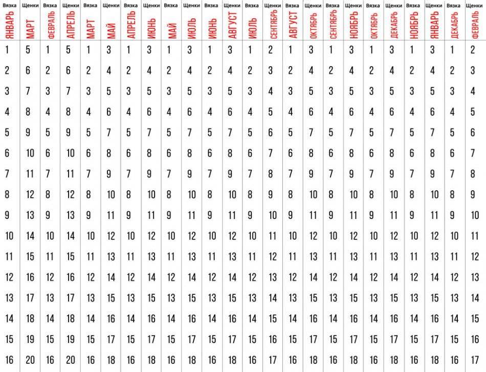 Чтобы было удобнее сориентироваться, сколько беременность у собаки будет протекать, составьте календарик и по нему отмечайте. Приведем ниже пример такого календаря.
