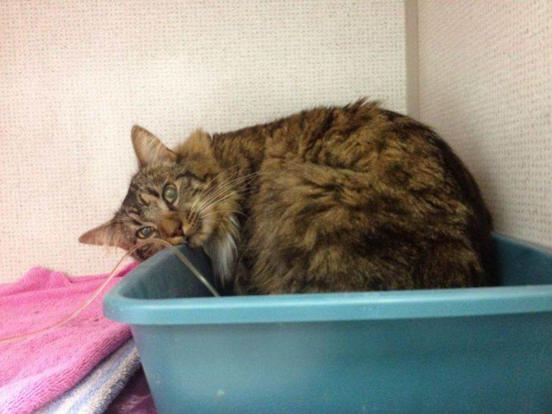 - Острая. Отличается стремительным развитием и появлением выраженных симптомов. Понять, что у кота острое воспаление мочевого пузыря не сложно. Животное становится беспокойным и раздражительным, что связано с появлением сильных болей при мочеиспускании. Кошка начинает ходить в туалет мимо лотка. Моча приобретает неприятный запах. Острый цистит развивается в течение нескольких часов, при отсутствии лечения он приобретает затяжное течение.