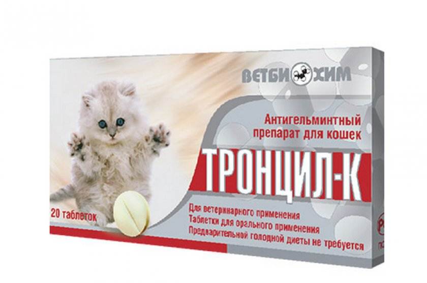 Тронцил К в таблетках не менее эффективное антигельминтное средство, разрешенное для трехнедельных котят. Этот двухкомпонентный препарат назначается в дозировке таблетки/кг веса. Не вызывает побочных реакций, но для котят младше 3 недель не применяется.