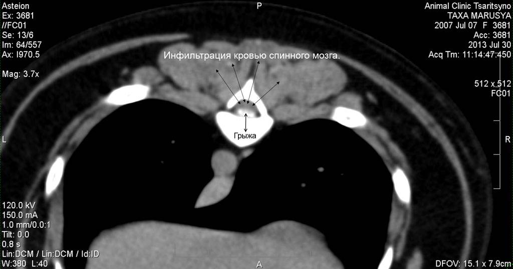 Чтобы исключить или обнаружить межпозвоночную грыжу необходимо сделать рентген. А в особенно тяжёлых или спорных случаях установить диагноз невозможно без миелограммы – введения в спинной мозг животного окрашенной жидкости для более чёткой картины на рентгеновском снимке.