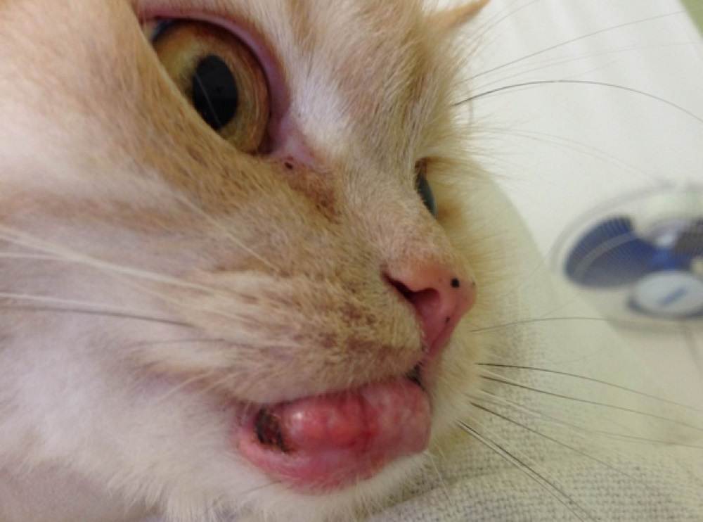 Встречается на краю верхней губы кошки. Образуется она быстро, закрывая значительную часть поверхности. Поражённая область опухает.