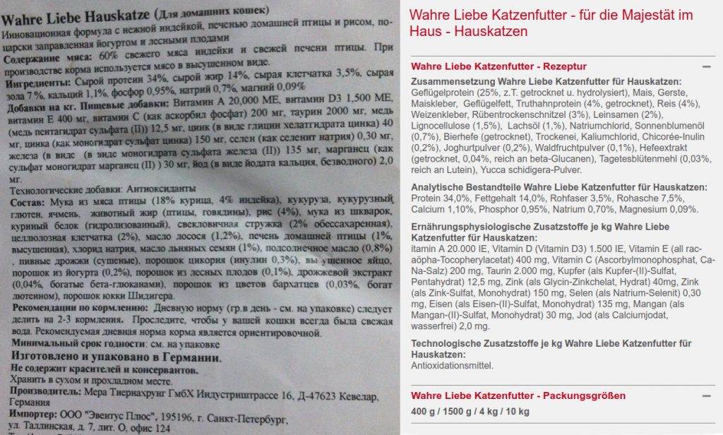 Рассмотрим состав корма Wahre Liebe на примере варианта Hauskatzen (для домашних кошек). Ознакомиться с ним можно на изображении ниже, рекомендуем кликнуть по нему чтобы увеличить для удобности чтения:
